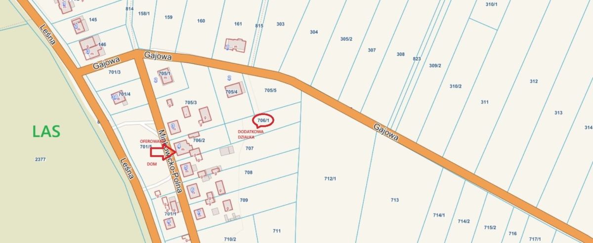 Działka 706/1 sąsiaduje bezpośrednio z działką 706/2, znajduje się z tyłu,tj. za ogrodem działki 706/2.